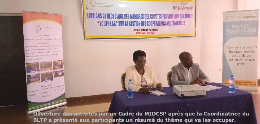 Dans le cadre du projet FIPP"Foundations for Inclusive and Peaceful Politics [Fondation pour une politique inclusive et pacifique]" de l’Institut Néerlandais pour la Démocratie Multipartite (NIMD) et dont certaines activités sont mise en œuvre par le BLTP, deux ateliers de recyclage sur la gestion des coopératives à l’intention de 76 membres des comités provinciaux des Youth-LAB (Jeunes Leaders politiques pour l’Avenir du Burundi) ont été organisés du 18 au 19 juin 2024 pour le premier, et du 20 au 21 juin 2024 pour le second.